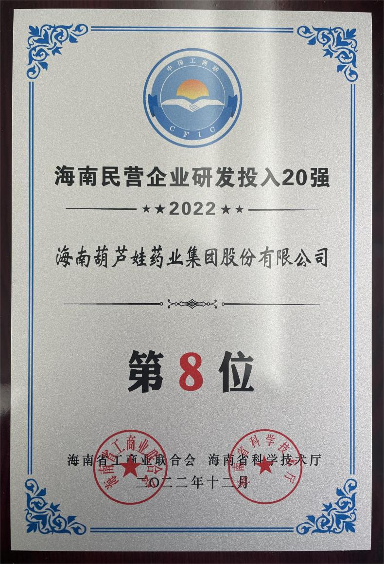 12月23日,2022海南民营企业50强和研发投入20强发布会在海口举行。会上发布了“2022海南民营企业50强”“2022海南民营企业研发投入20强”榜单和分析报告。AG庄闲药业再次荣登两榜,在海南民营企业50强榜单中位列第25位,较去年上升8位,这也是公司连续三年登榜;在海南民营企业研发投入20强中位列第8位,较去年上升7位。